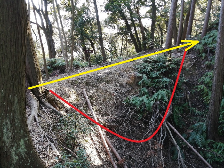 本曲輪の手前で土橋に遭遇。(黄色が土橋、赤色が堀)