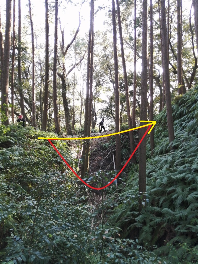 【横堀】曲輪の斜面に対して直角に掘られた堀です。武田氏が良く使ったそうです。