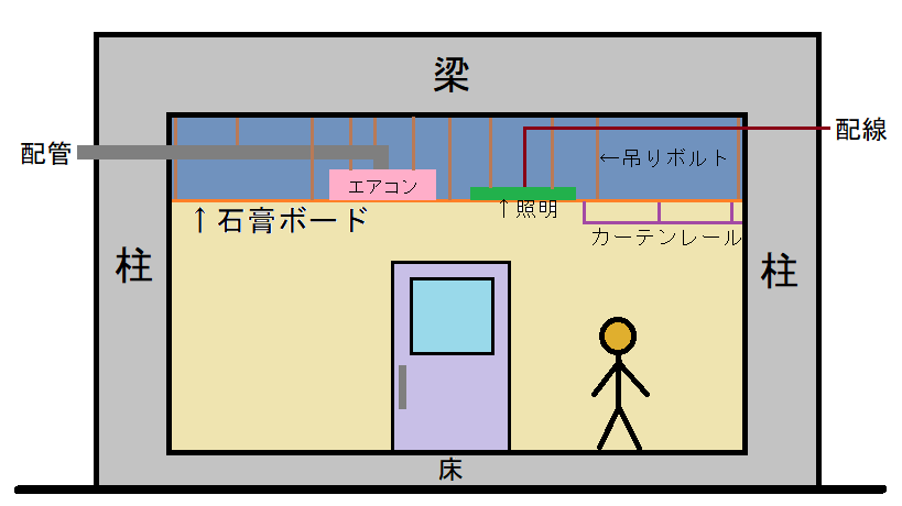 照明、エアコン、消防設備、配管や配線などが梁から吊られて天井裏に隠されているヨ。